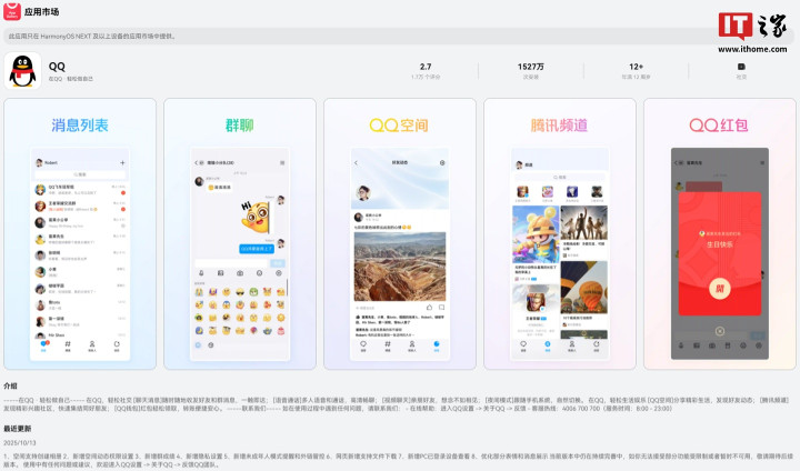 IT之家10月29日消息,QQ鸿蒙版App今日在华为应用市场(AppGallery)开启了9.1.90(2412)版本尝鲜升级(无需收到短信通知后点击链接跳转安装,可能量少,未来得及安装需等待官方“补货”),测试时间为2025/10/29-2025/11/27。
